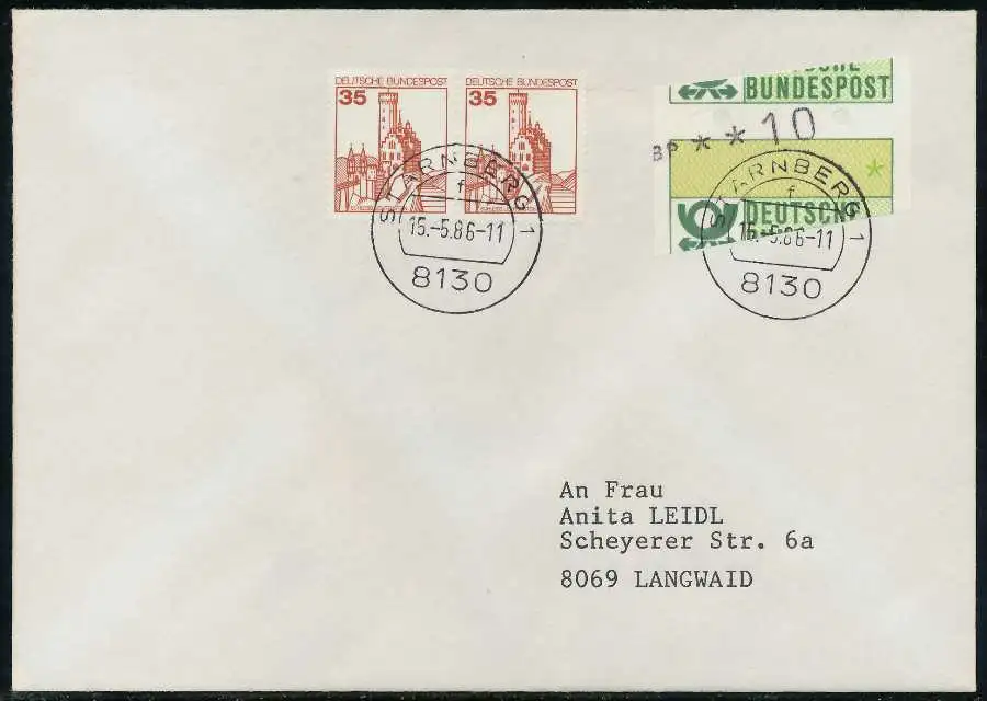 Normalbrief mit ATM1-010, sogenannter "Starnberger Reiter bzw. Starnberger Springer", beiliegend Quittung des Automaten mit Datum 15.05.1986, zusätzlich 35 Pfg waagerechtes Paar aus der Serie Burgen und Schlösser.