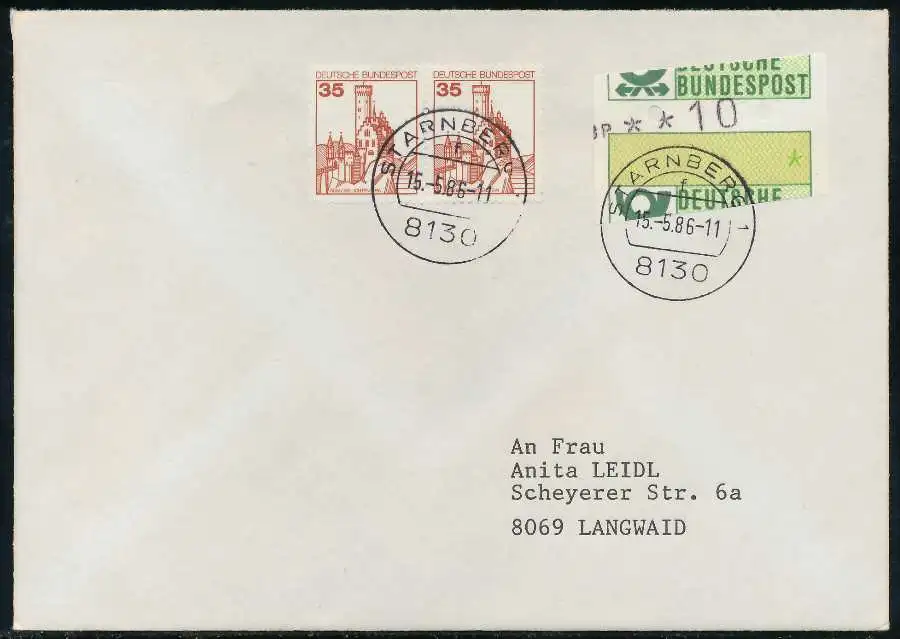 Normalbrief mit ATM1-010, sogenannter "Starnberger Reiter bzw. Starnberger Springer", beiliegend Quittung des Automaten mit Datum 15.05.1986, zusätzlich 35 Pfg waagerechtes Paar aus der Serie Burgen und Schlösser.