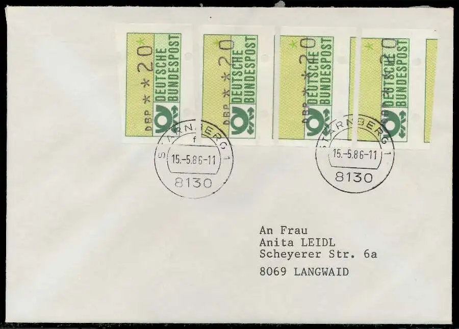 Normalbrief mit ATM1-020 (4 mal), sogenannter "Starnberger Reiter bzw. Starnberger Springer", beiliegend der Einlieferungsschein und Quittung des Automaten mit Datum 15.05.1986