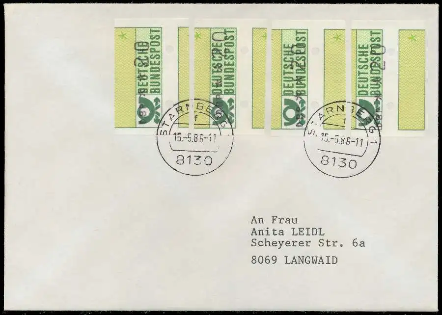Normalbrief mit ATM1-020 (4 mal), sogenannter "Starnberger Reiter bzw. Starnberger Springer", beiliegend der Einlieferungsschein und Quittung des Automaten mit Datum 15.05.1986