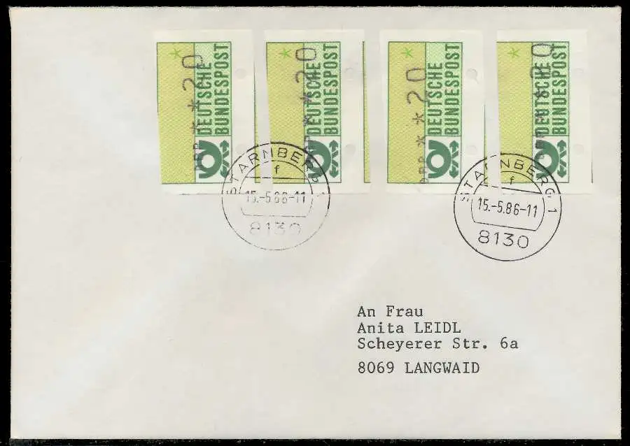 Normalbrief mit ATM1-020 (4 mal), sogenannter "Starnberger Reiter bzw. Starnberger Springer", beiliegend der Einlieferungsschein und Quittung des Automaten mit Datum 15.05.1986