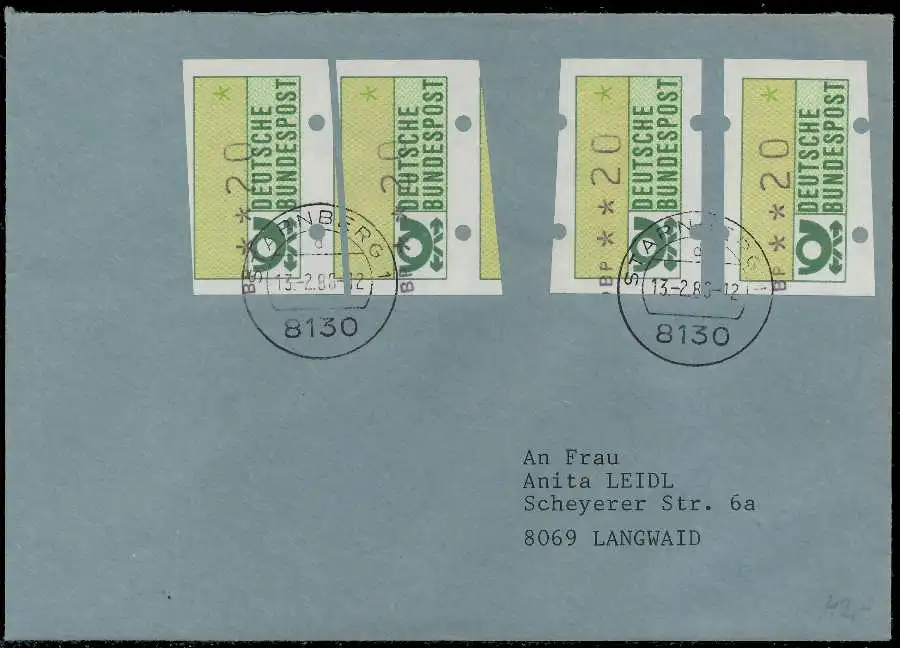 Normalbrief mit ATM1-020 (4 mal), sogenannter "Starnberger Reiter bzw. Starnberger Springer", beiliegend Quittung des Automaten mit Datum 13.02.1986