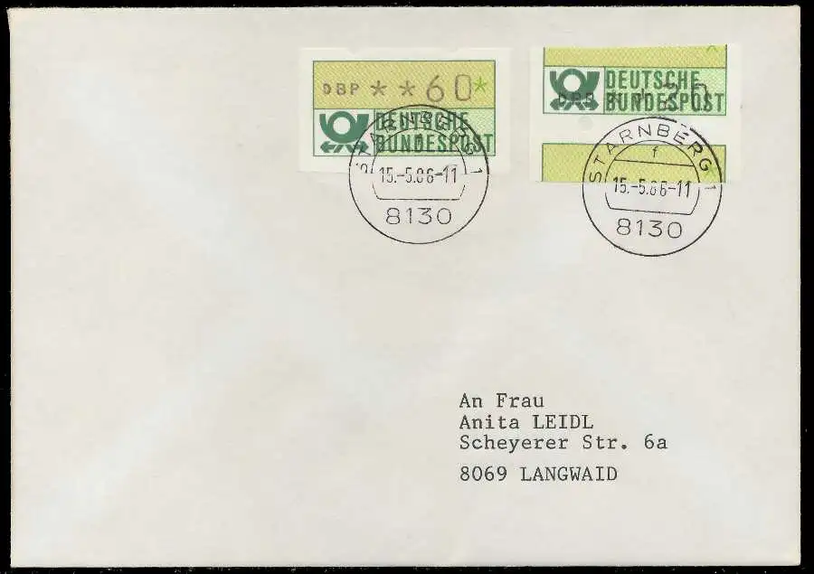 Normalbrief mit ATM1-020, sogenannter "Starnberger Reiter bzw. Starnberger Springer", sowie Normalmarke mit 060, beiliegend die Quittung des Automaten mit Datum 15.05.1986