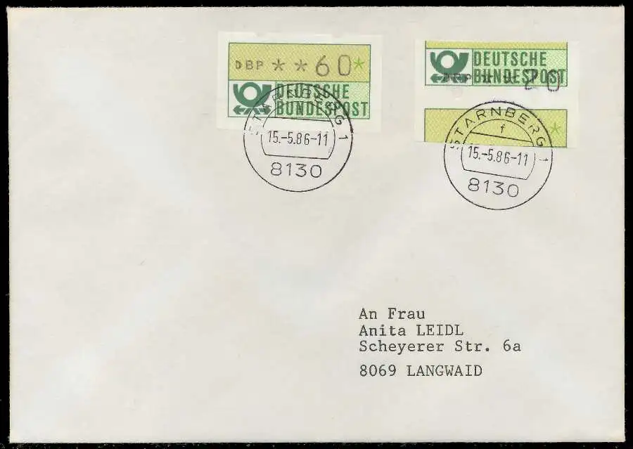 Normalbrief mit ATM1-020, sogenannter "Starnberger Reiter bzw. Starnberger Springer", sowie Normalmarke mit 060, beiliegend die Quittung des Automaten mit Datum 13.02.1986
