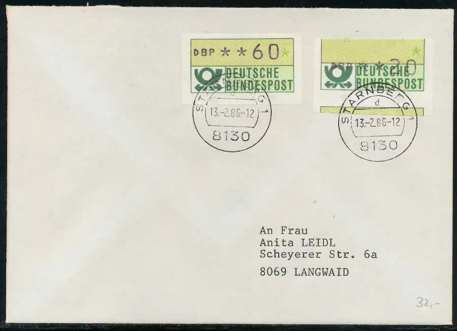 Normalbrief mit ATM1-020, sogenannter "Starnberger Reiter bzw. Starnberger Springer", sowie Normalmarke mit 060, beiliegend die Quittung des Automaten mit Datum 13.02.1986