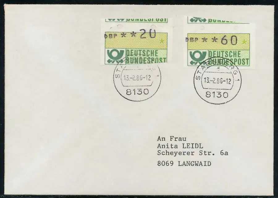 Normalbrief mit ATM1-020 und 060, sogenannter "Starnberger Reiter bzw. Starnberger Springer", beiliegend die Quittung des Automaten mit Datum 13.02.1986