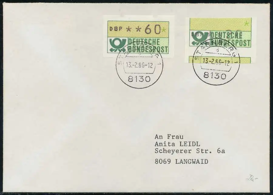 Normalbrief mit ATM1-020, sogenannter "Starnberger Reiter bzw. Starnberger Springer", sowie Normalmarke mit 060, beiliegend die Quittung des Automaten mit Datum 13.02.1986