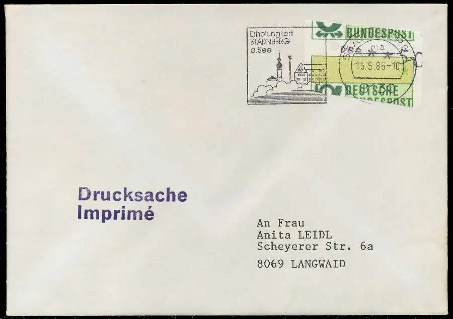 Drucksache mit ATM1-050, sogenannter "Starnberger Reiter bzw. Starnberger Springer", beiliegend die Quittung des Automaten mit Datum 15.05.1986