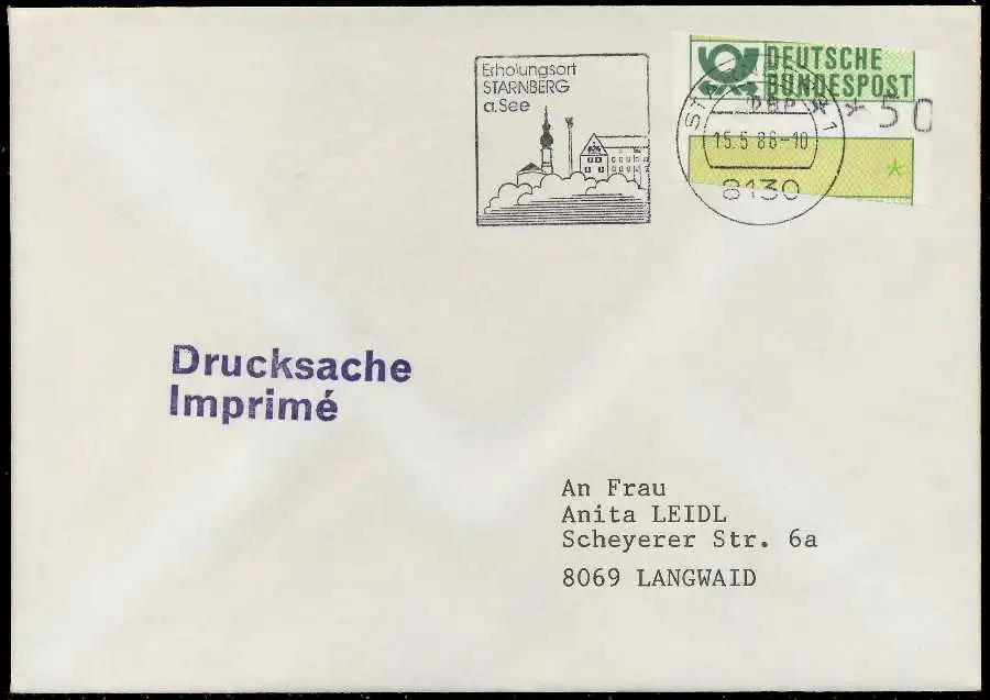 Drucksache mit ATM1-050, sogenannter "Starnberger Reiter bzw. Starnberger Springer", beiliegend die Quittung des Automaten mit Datum 15.05.1986