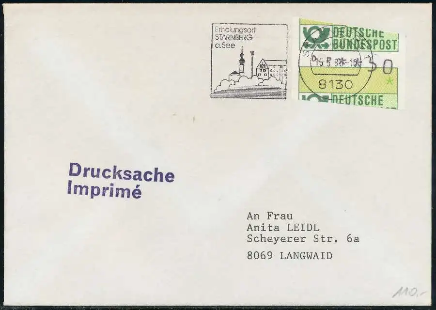 Drucksache mit ATM1-050, sogenannter "Starnberger Reiter bzw. Starnberger Springer", beiliegend die Quittung des Automaten mit Datum 15.05.1986