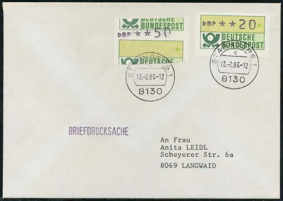 Briefdrucksache mit ATM1-050, sogenannter "Starnberger Reiter bzw. Starnberger Springer", sowie Normalmarke mit 020, beiliegend die Quittung des Automaten mit Datum 13.02.1986
