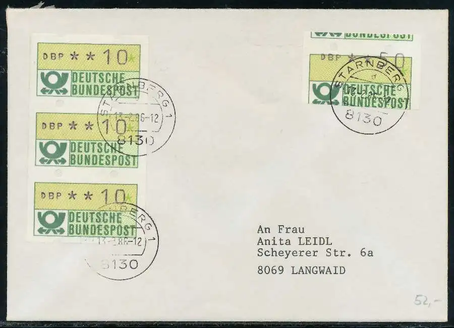 Normalbrief mit ATM1-065, sogenannter "Starnberger Reiter bzw. Starnberger Springer", sowie Normalmarken 010 im unzertrenntem 3er-Streifen, beiliegend die Quittung des Automaten mit Datum 13.02.1986