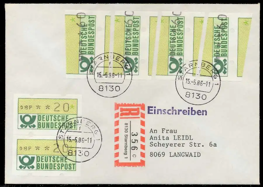 Einschreiben mit ATM1-060 (4 mal), sogenannter "Starnberger Reiter bzw. Starnberger Springer", + Normalmarke 020 (2 mal), beiliegend der Einlieferungsschein und Quittung des Automaten mit Datum 15.05.1986