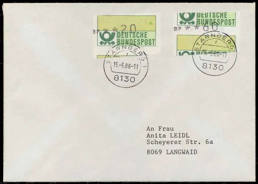Normalbrief mit ATM1-060 und 020, sogenannter "Starnberger Reiter bzw. Starnberger Springer", beiliegend die Quittung des Automaten mit Datum 15.05.1986