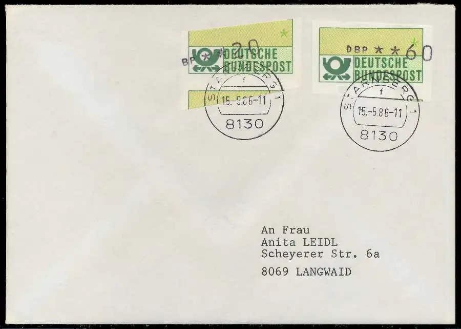 Normalbrief mit ATM1-060 und 020, sogenannter "Starnberger Reiter bzw. Starnberger Springer", beiliegend die Quittung des Automaten mit Datum 15.05.1986