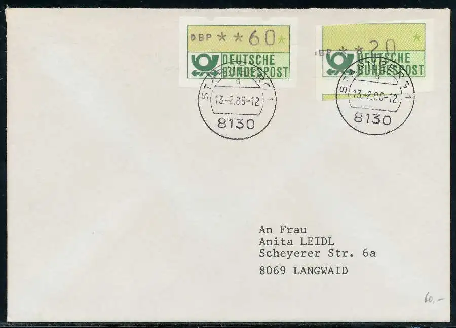 Normalbrief mit ATM1-020 und 060 (Normalmarke), sogenannter "Starnberger Reiter bzw. Starnberger Springer", beiliegend die Quittung des Automaten mit Datum 13.02.1986