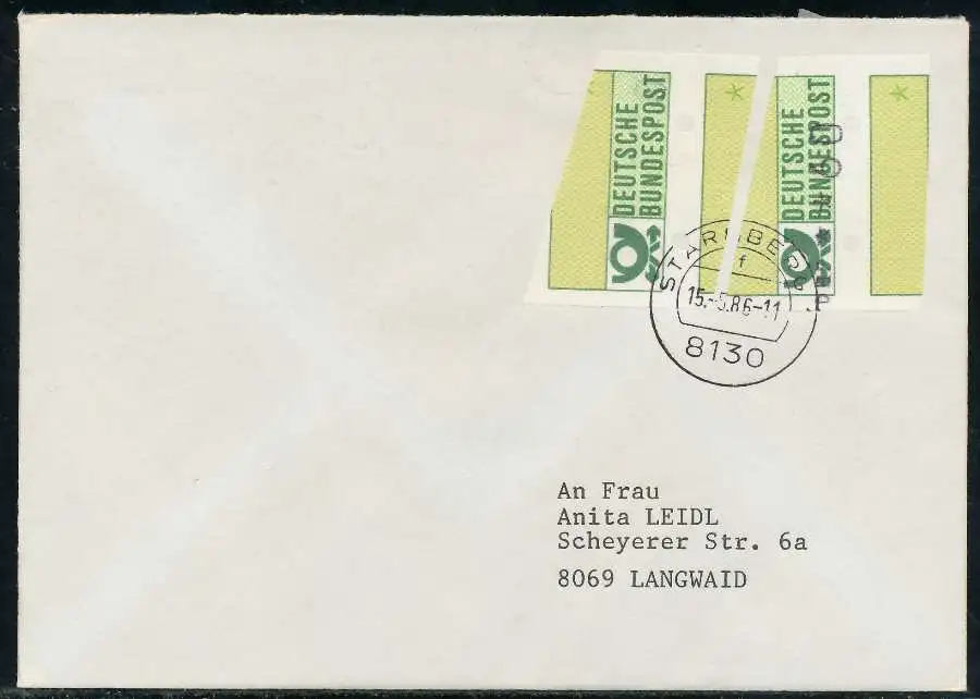 Normalbrief mit ATM1-060 und 020 (ohne Wert-Eindruck), sogenannter "Starnberger Reiter bzw. Starnberger Springer", beiliegend die Quittung des Automaten mit Datum 15.05.1986