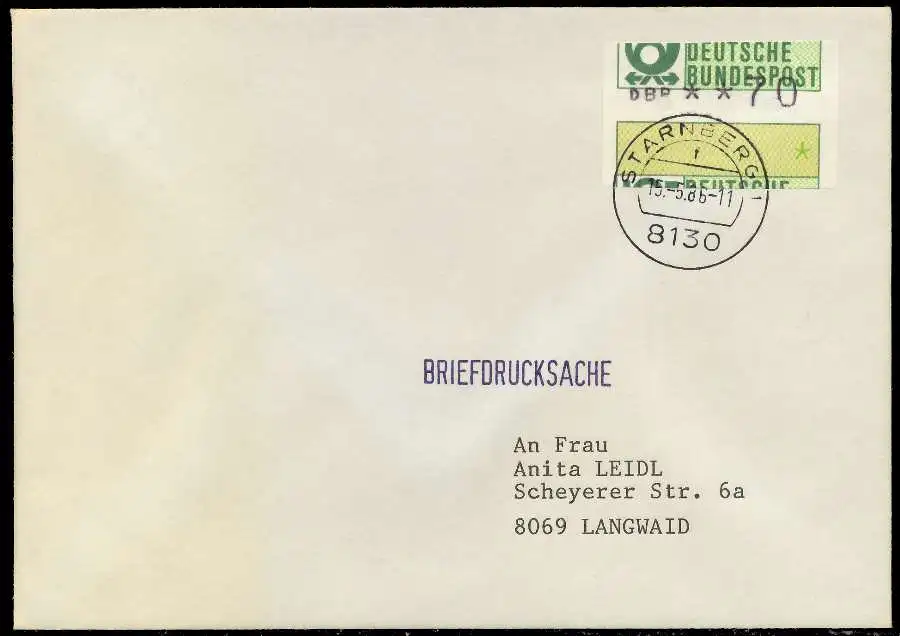 Briefdrucksache mit ATM1-070, sogenannter "Starnberger Reiter bzw. Starnberger Springer", beiliegend die Quittung des Automaten mit Datum 15.05.1986