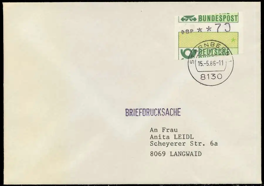 Briefdrucksache mit ATM1-070, sogenannter "Starnberger Reiter bzw. Starnberger Springer", beiliegend die Quittung des Automaten mit Datum 15.05.1986