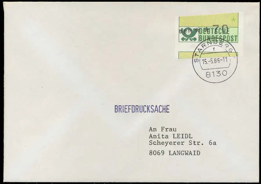 Briefdrucksache mit ATM1-070, sogenannter "Starnberger Reiter bzw. Starnberger Springer", beiliegend die Quittung des Automaten mit Datum 15.05.1986