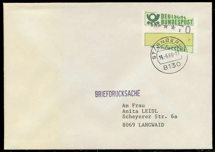 Briefdrucksache mit ATM1-070, sogenannter "Starnberger Reiter bzw. Starnberger Springer", beiliegend die Quittung des Automaten mit Datum 15.05.1986