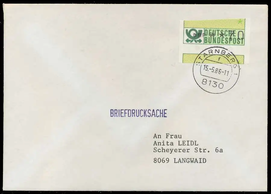 Briefdrucksache mit ATM1-070, sogenannter "Starnberger Reiter bzw. Starnberger Springer", beiliegend die Quittung des Automaten mit Datum 15.05.1986