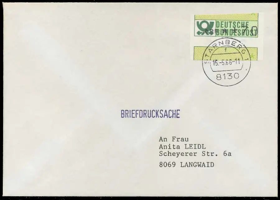 Briefdrucksache mit ATM1-070, sogenannter "Starnberger Reiter bzw. Starnberger Springer", beiliegend die Quittung des Automaten mit Datum 15.05.1986