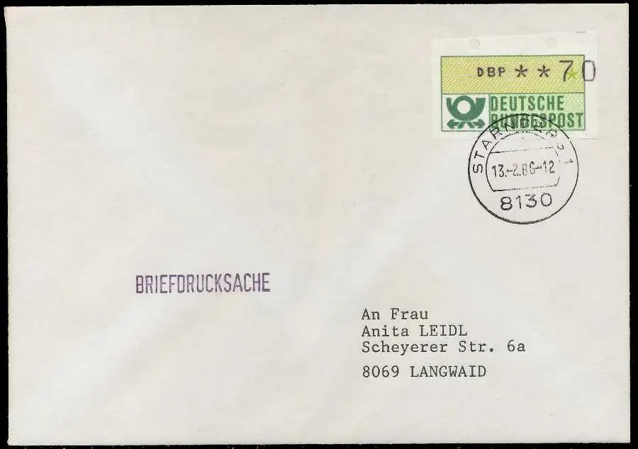 Briefdrucksache mit ATM1-070, sogenannter "Starnberger Reiter bzw. Starnberger Springer", beiliegend die Quittung des Automaten mit Datum 15.05.1986