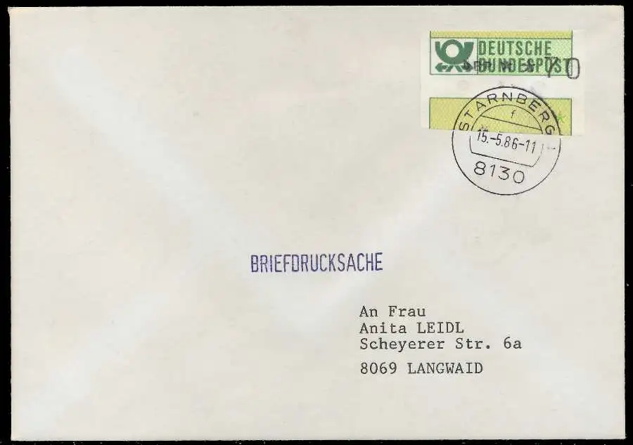 Briefdrucksache mit ATM1-070, sogenannter "Starnberger Reiter bzw. Starnberger Springer", beiliegend die Quittung des Automaten mit Datum 15.05.1986