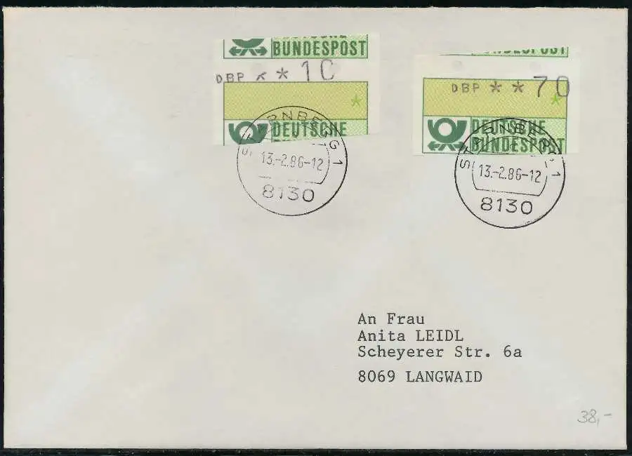 Normalbrief mit ATM1-070 und 010, sogenannter "Starnberger Reiter bzw. Starnberger Springer", beiliegend die Quittung des Automaten mit Datum 13.02.1986