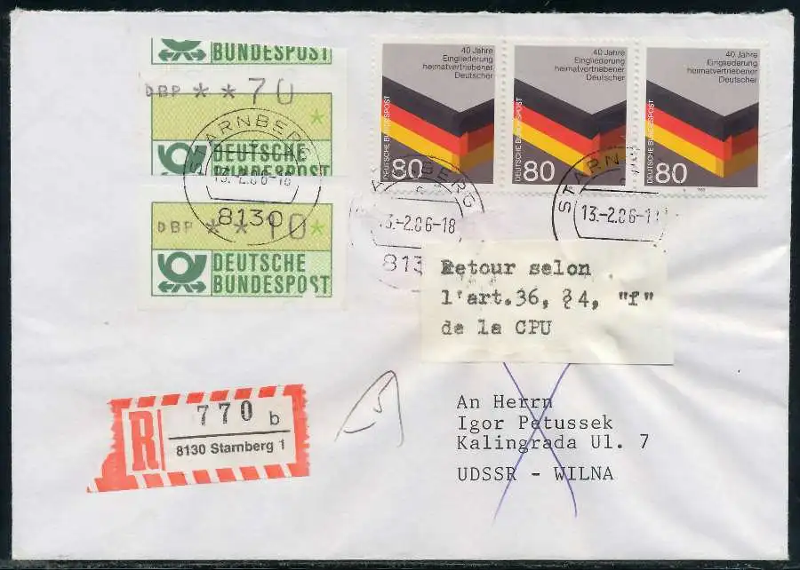 Einschreiben mit ATM1-070, sogenannter "Starnberger Reiter bzw. Starnberger Springer" und 010 Normalmarke, beiliegend der Einlieferungsschein und Quittung des Automaten mit Datum 13.02.1986
