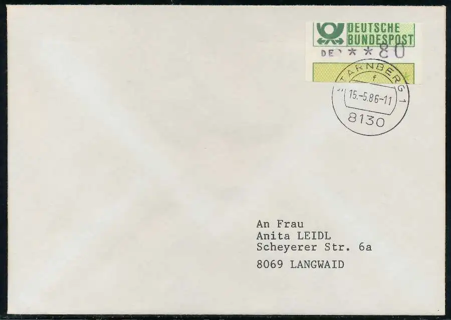 Normalbrief mit ATM1-080, sogenannter "Starnberger Reiter bzw. Starnberger Springer", beiliegend die Quittung des Automaten mit Datum 15.05.1986