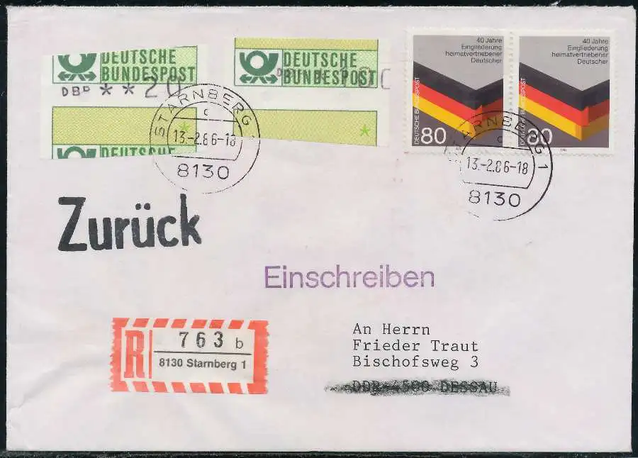 Einschreiben mit ATM1-100+020, sogenannter "Starnberger Reiter bzw. Starnberger Springer", beiliegend der Einlieferungsschein und Quittung des Automaten mit Datum 13.02.1986