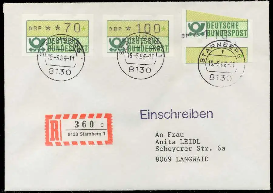 Einschreiben mit ATM1-110, sogenannter "Starnberger Reiter bzw. Starnberger Springer", + Normalmarken 100+070, beiliegend der Einlieferungsschein und Quittung des Automaten mit Datum 15.05.1986