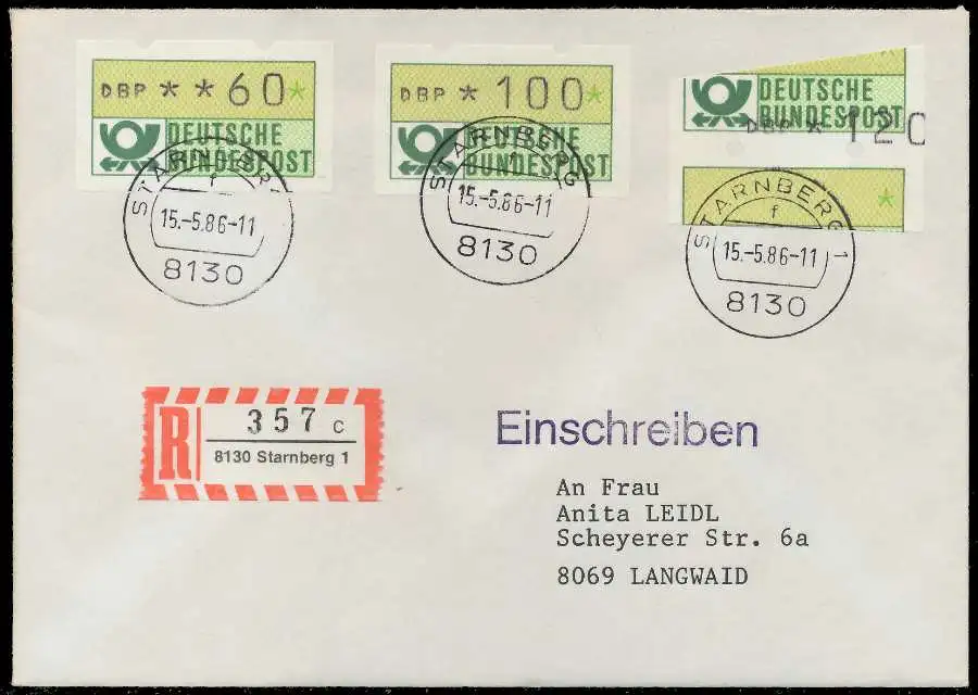 Einschreiben mit ATM1-120, sogenannter "Starnberger Reiter bzw. Starnberger Springer", + Normalmarken 100+060, beiliegend der Einlieferungsschein und Quittung des Automaten mit Datum 15.05.1986