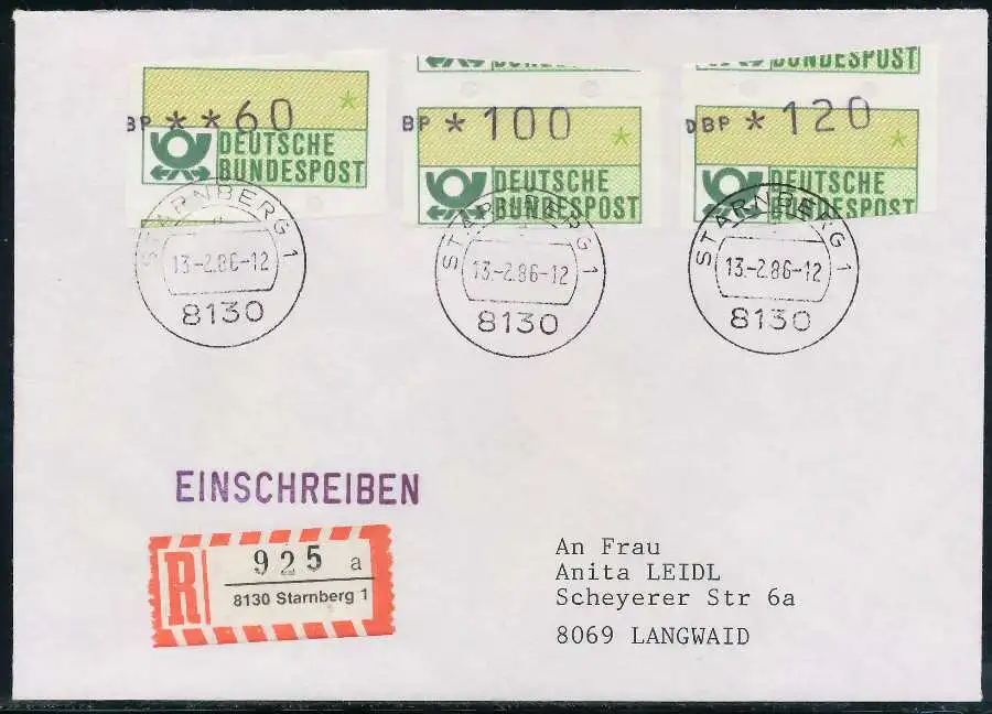 Einschreiben mit ATM1-120+100+060, sogenannter "Starnberger Reiter bzw. Starnberger Springer", beiliegend der Einlieferungsschein und Quittung des Automaten mit Datum 13.02.1986