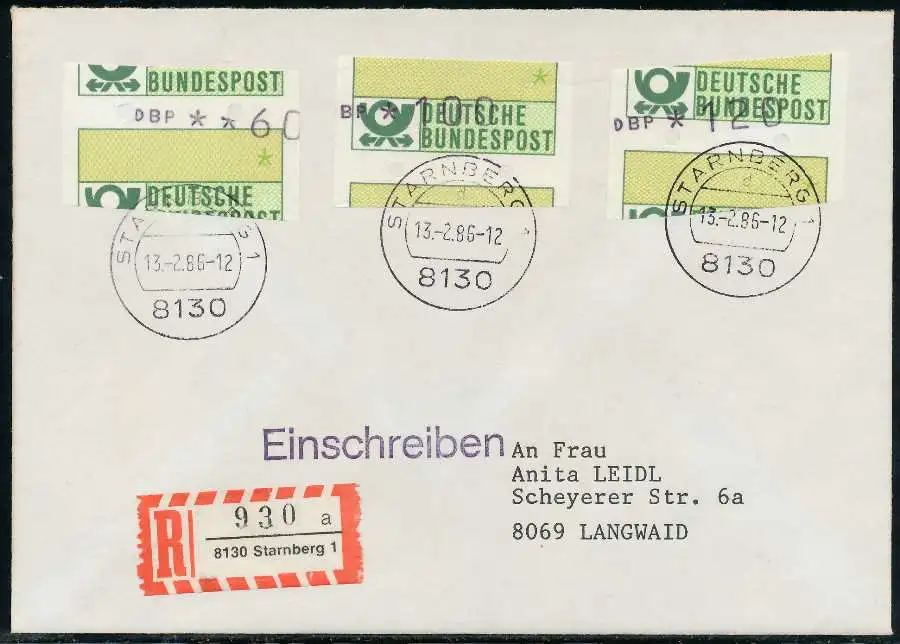 Einschreiben mit ATM1-120+100+060, sogenannter "Starnberger Reiter bzw. Starnberger Springer", beiliegend der Einlieferungsschein und Quittung des Automaten mit Datum 13.02.1986
