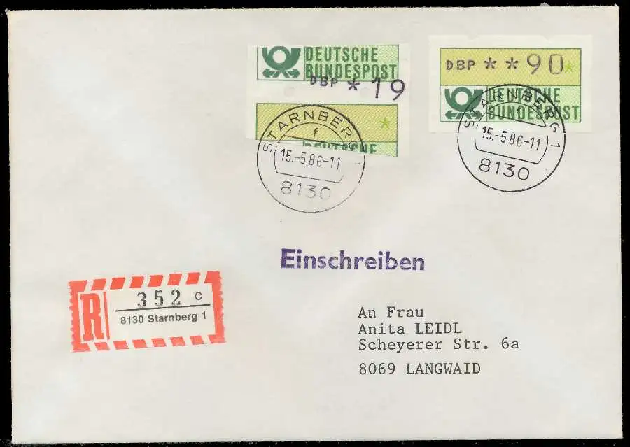Einschreiben mit ATM1-190, sogenannter "Starnberger Reiter bzw. Starnberger Springer", + Normalmarke 090, beiliegend der Einlieferungsschein und Quittung des Automaten mit Datum 15.05.1986