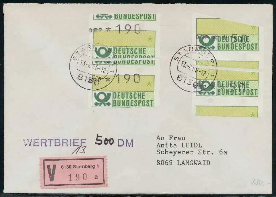Versiegelter Wertbrief 500 DM mit ATM1-190 und 050, sogenannter "Starnberger Reiter bzw. Starnberger Springer", beiliegend der Einlieferungsschein und Quittung des Automaten mit Datum 13.02.1986