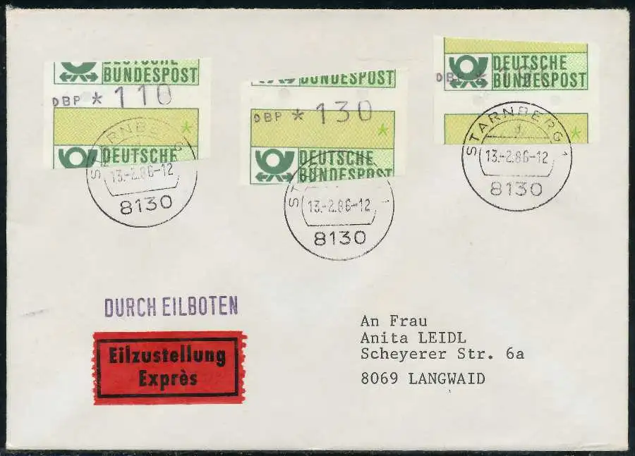 Eilbrief mit ATM1-190 und 130 und 110, sogenannter "Starnberger Reiter bzw. Starnberger Springer", beiliegend Quittung vom Automaten mit Datum vom 01.08.85