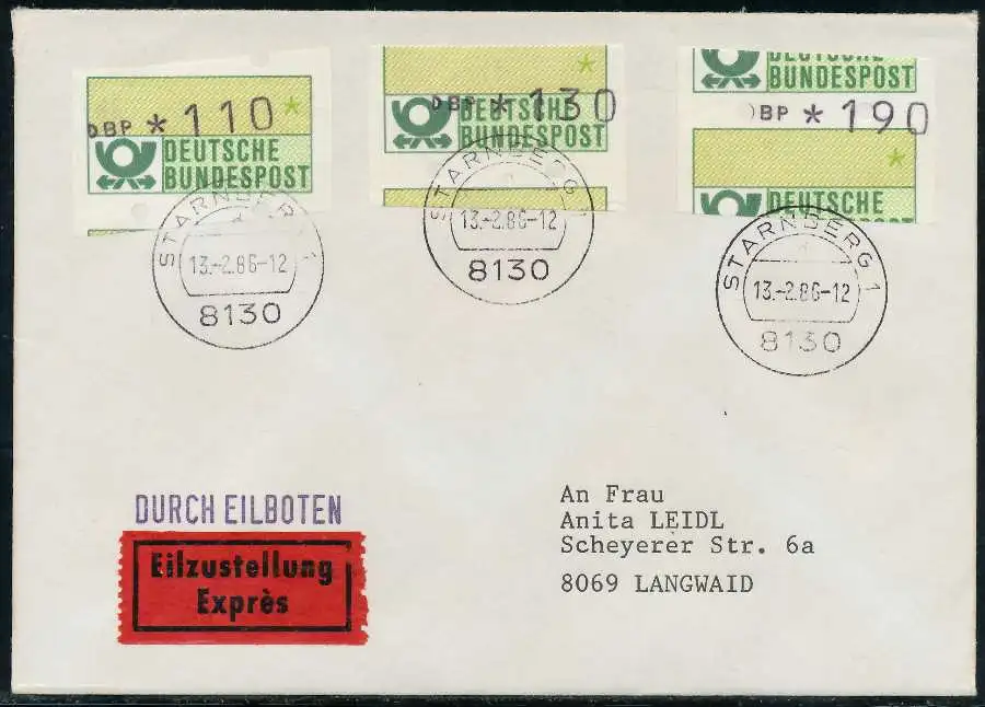 Eilbrief mit ATM1-190 und 130 und 110, sogenannter "Starnberger Reiter bzw. Starnberger Springer", beiliegend Quittung vom Automaten mit Datum vom 01.08.85