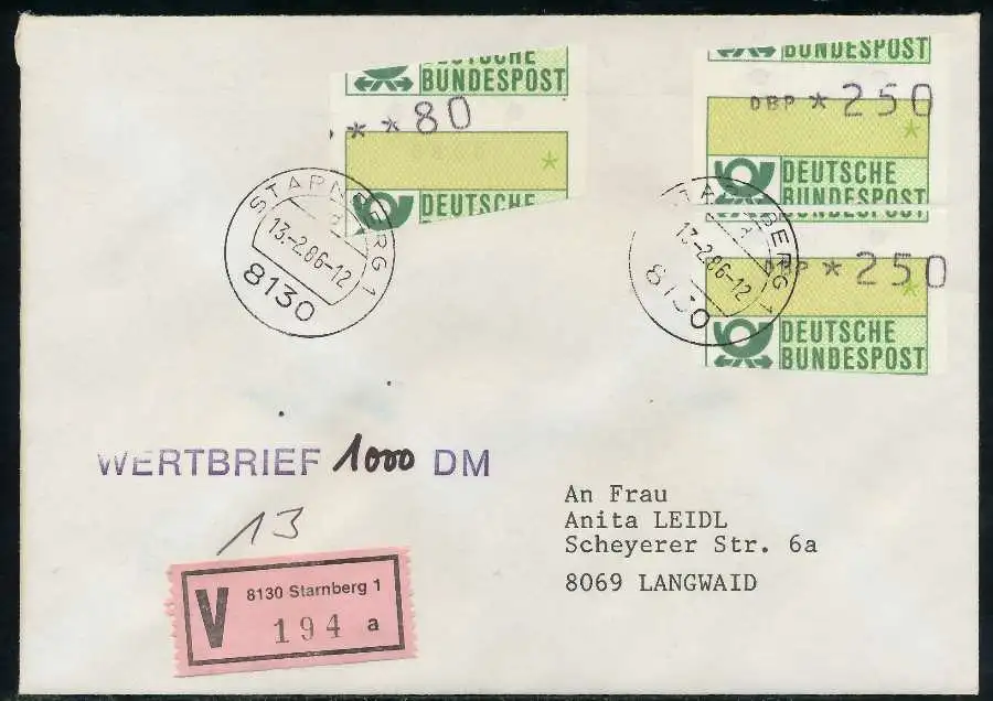 Versiegelter Wertbrief 1000 DM mit ATM1-250 und 080, sogenannter "Starnberger Reiter bzw. Starnberger Springer", beiliegend der Einlieferungsschein und Quittung des Automaten mit Datum 13.02.1986