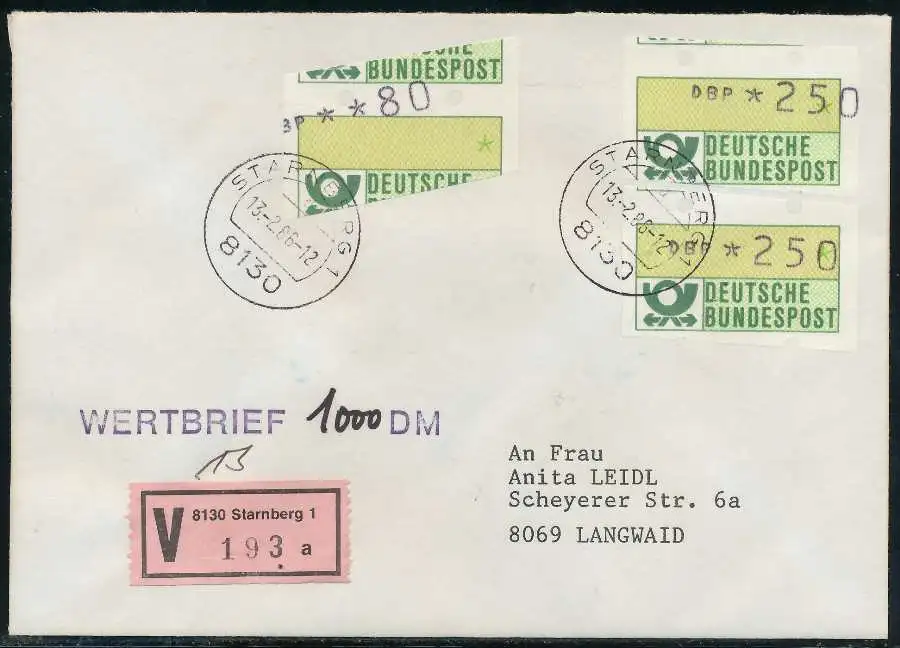 Versiegelter Wertbrief 1000 DM mit ATM1-250 und 080, sogenannter "Starnberger Reiter bzw. Starnberger Springer", beiliegend der Einlieferungsschein und Quittung des Automaten mit Datum 13.02.1986