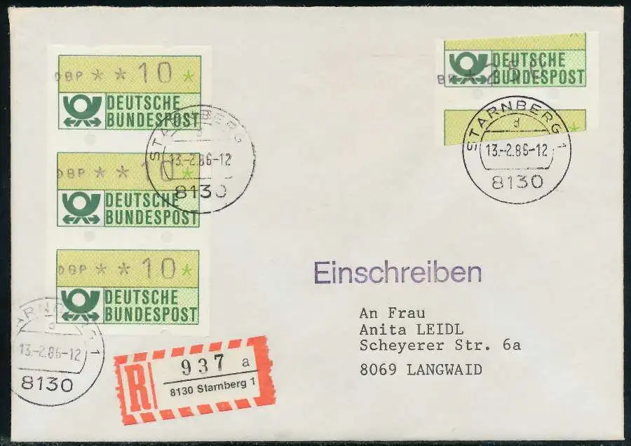 Einschreiben mit ATM1-250 + 010 (im zusammenhängenden 3er Streifen), sogenannter "Starnberger Reiter bzw. Starnberger Springer", beiliegend der Einlieferungsschein und Quittung des Automaten mit Datum 13.02.1986