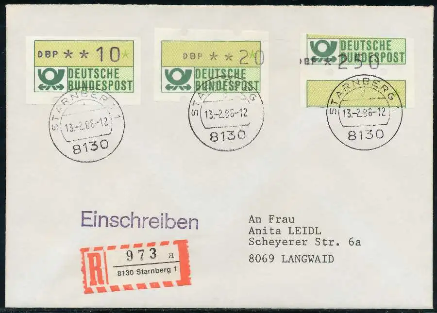 Einschreiben mit ATM1-250 + 020 + 010, sogenannter "Starnberger Reiter bzw. Starnberger Springer", beiliegend der Einlieferungsschein und Quittung des Automaten mit Datum 13.02.1986