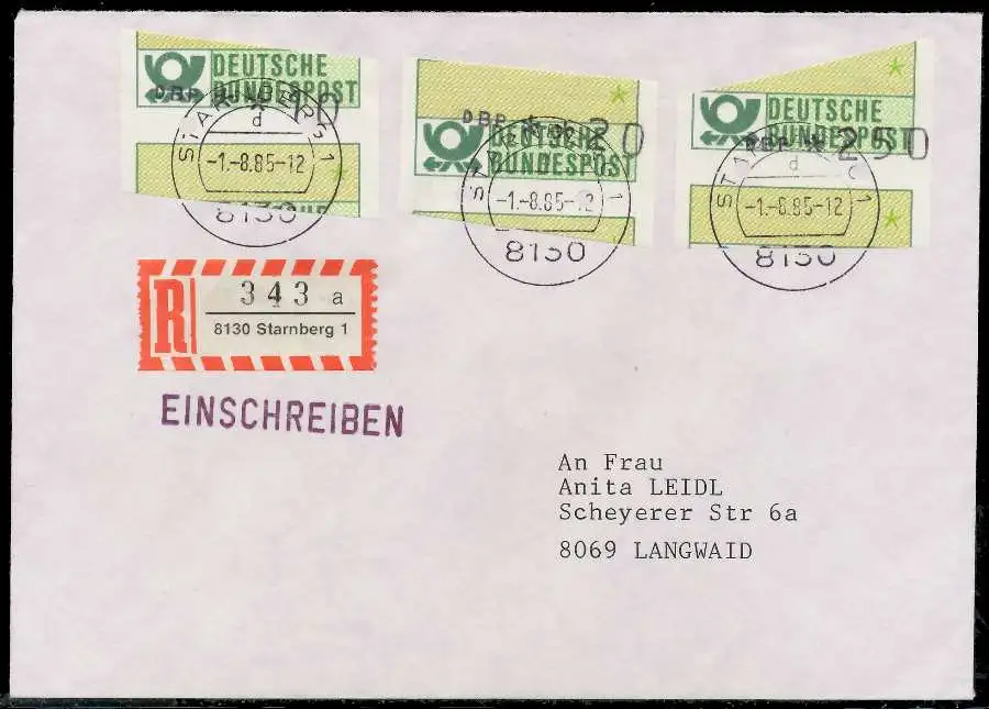 Einschreiben mit ATM1-250 + 020 + 010, sogenannter "Starnberger Reiter bzw. Starnberger Springer", beiliegend der Einlieferungsschein und Quittung des Automaten mit Datum 13.02.1986