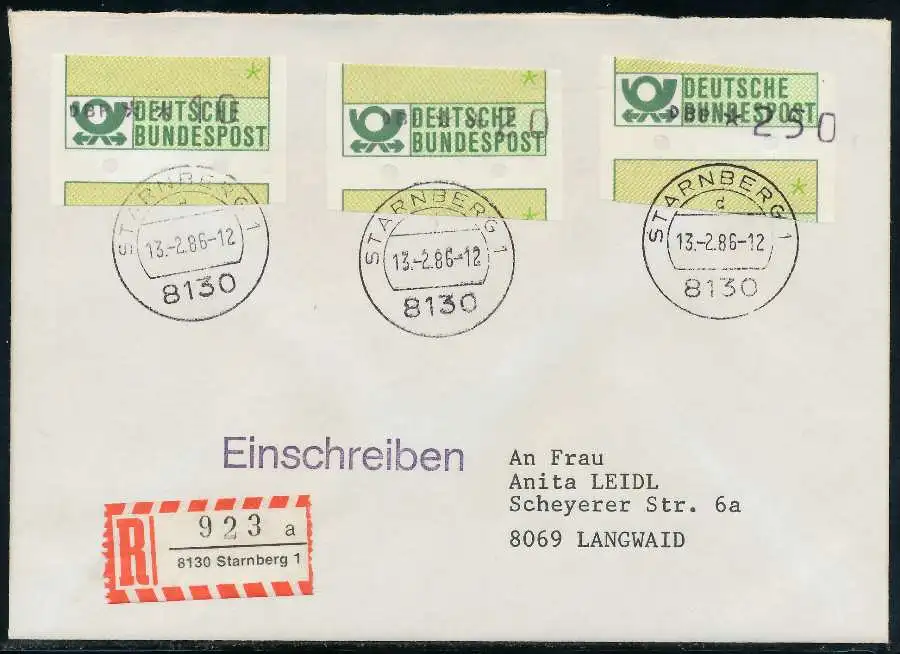 Einschreiben mit ATM1-250 + 020 + 010, sogenannter "Starnberger Reiter bzw. Starnberger Springer", beiliegend der Einlieferungsschein und Quittung des Automaten mit Datum 13.02.1986