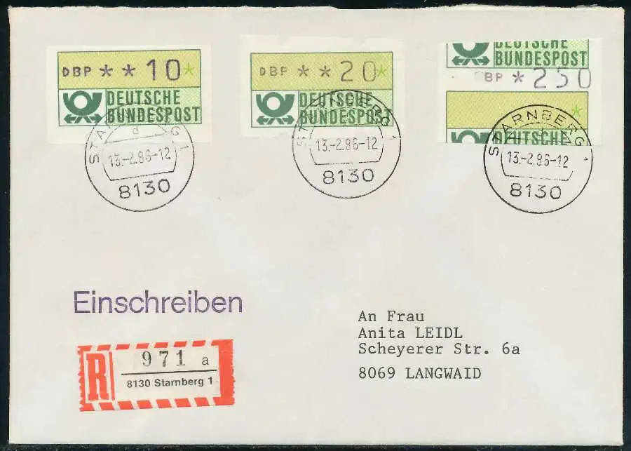 Einschreiben mit ATM1-250 + 020 + 010, sogenannter "Starnberger Reiter bzw. Starnberger Springer", beiliegend der Einlieferungsschein und Quittung des Automaten mit Datum 13.02.1986