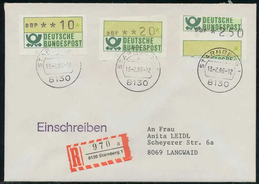 Einschreiben mit ATM1-250 + 020 + 010, sogenannter "Starnberger Reiter bzw. Starnberger Springer", beiliegend der Einlieferungsschein und Quittung des Automaten mit Datum 13.02.1986