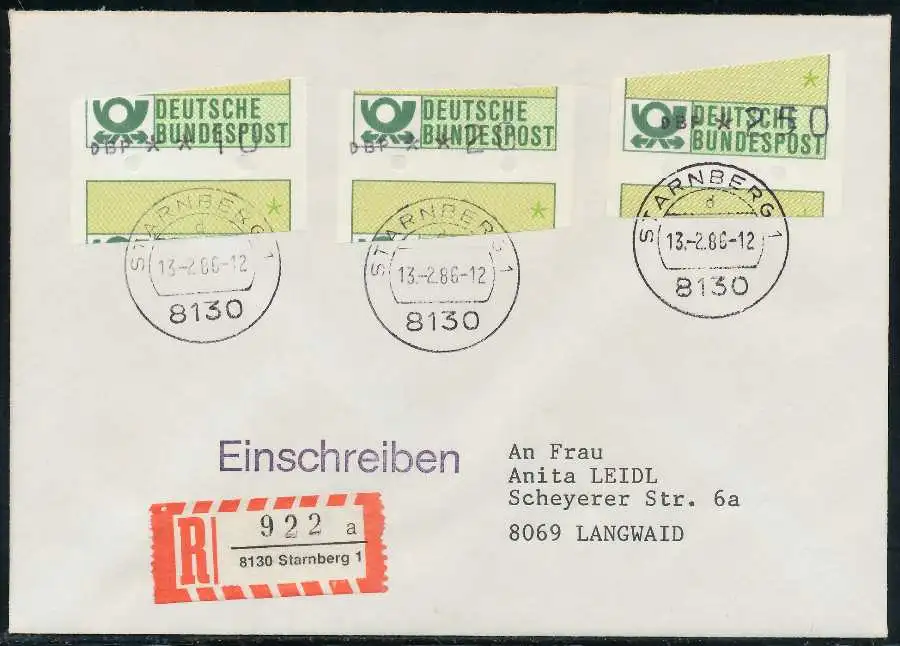 Einschreiben mit ATM1-250 + 020 + 010, sogenannter "Starnberger Reiter bzw. Starnberger Springer", beiliegend der Einlieferungsschein und Quittung des Automaten mit Datum 13.02.1986